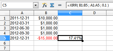 In this example, at the end of 2011, the portfolio value was $10,000. Throughout 2012, there were 3 contributions to the account at various times in the amount of $1,000. The final value at the end of 2012 was $15,000. Using the XIRR function, the return for this portfolio is 17.41%. If you were to simply subtract the $3,000 in contributions from the end value, then the return would be an overstated 20%.