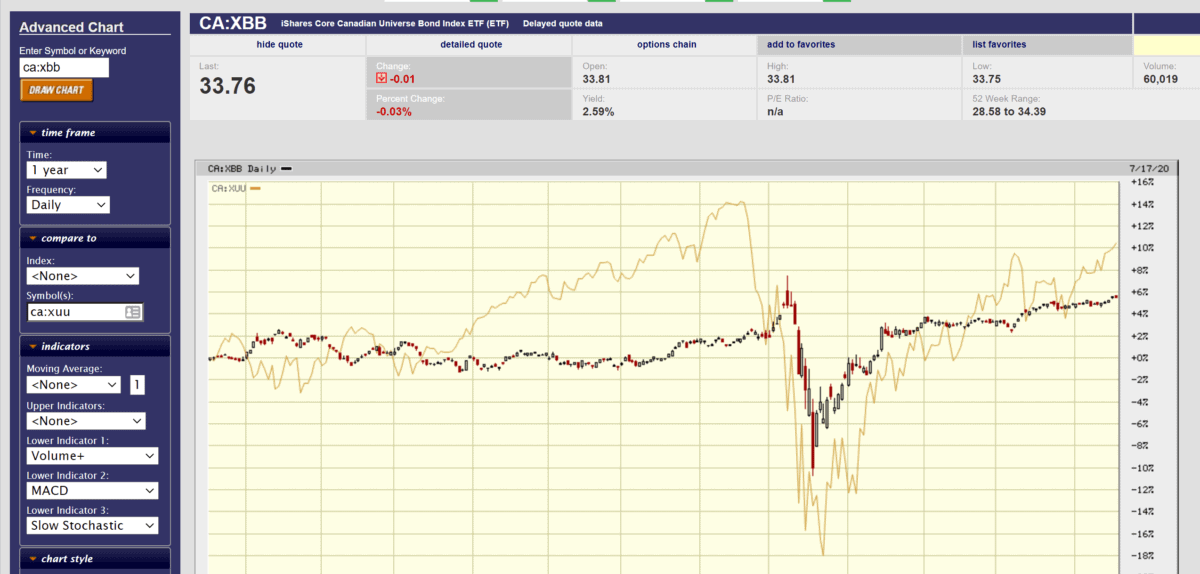 Big Charts – XUU vs XBB.TO (XUU is the line chart) – XUU wins