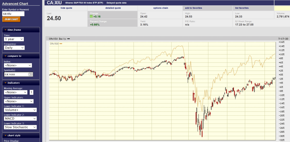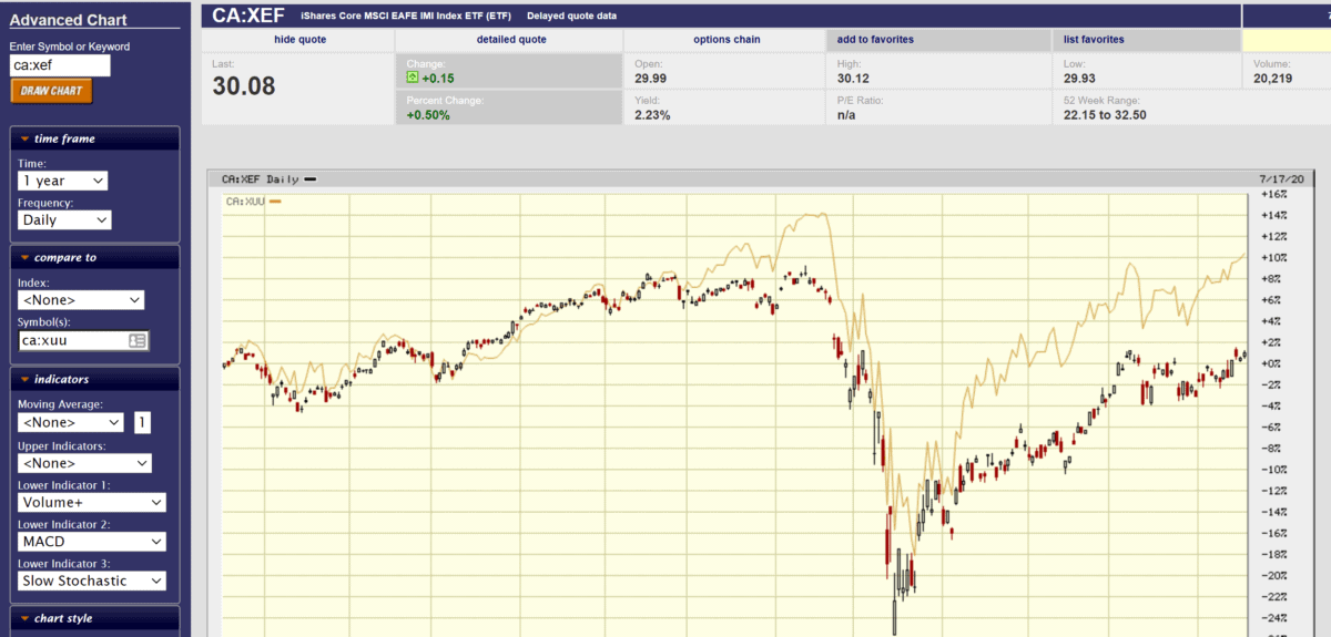 Big Charts – XUU vs XEF.TO (XUU is the line chart) – XUU wins